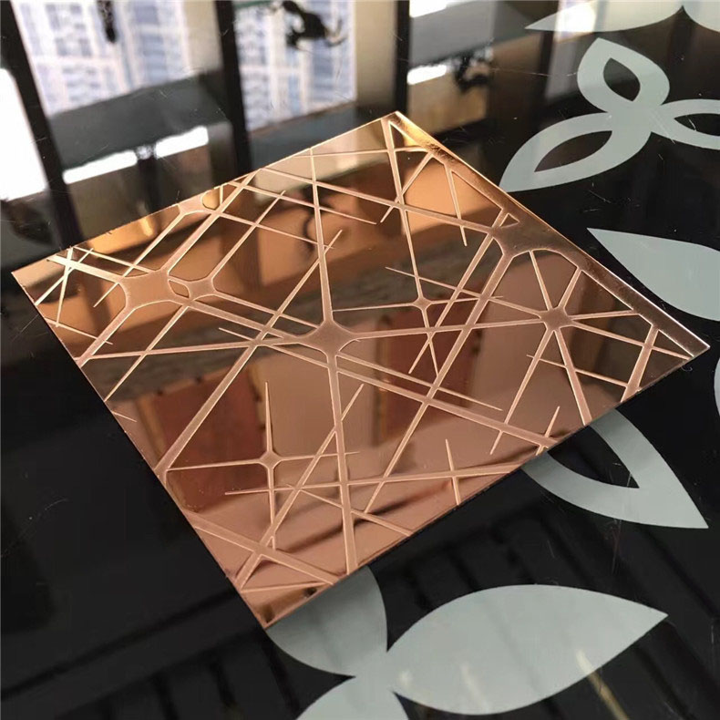 不銹鋼蝕刻板是在不銹鋼表面通過化學(xué)的方法,腐蝕出各種花紋圖案。以8K鏡面板、拉絲板、噴砂板為底板,進行蝕刻處理后,對物體表面再進行深加工,不銹鋼蝕刻板可進行局部的和紋,拉絲,嵌金,局部鈦金等各式復(fù)雜工藝處理,不銹鋼蝕刻板實現(xiàn)圖案明暗相間,色彩絢麗的效果。