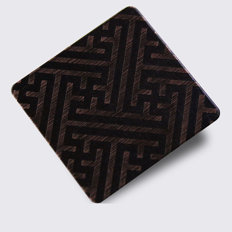 不銹鋼蝕刻板是在不銹鋼表面通過化學(xué)的方法,腐蝕出各種花紋圖案。以8K鏡面板、拉絲板、噴砂板為底板,進行蝕刻處理后,對物體表面再進行深加工,不銹鋼蝕刻板可進行局部的和紋,拉絲,嵌金,局部鈦金等各式復(fù)雜工藝處理,不銹鋼蝕刻板實現(xiàn)圖案明暗相間,色彩絢麗的效果。
